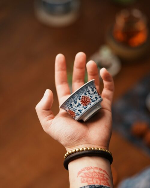 A small hand-painted horse-hoof cup with blue scrollwork and underglaze red lotus motifs on a clean white body. The 60cc size makes it ideal as a focused gongfu tea cup, bringing a refined traditional presence to the tea table. Its gently flared silhouette feels good in the hand, while the detailed painting adds warmth, craftsmanship, and a quietly collectible character.
